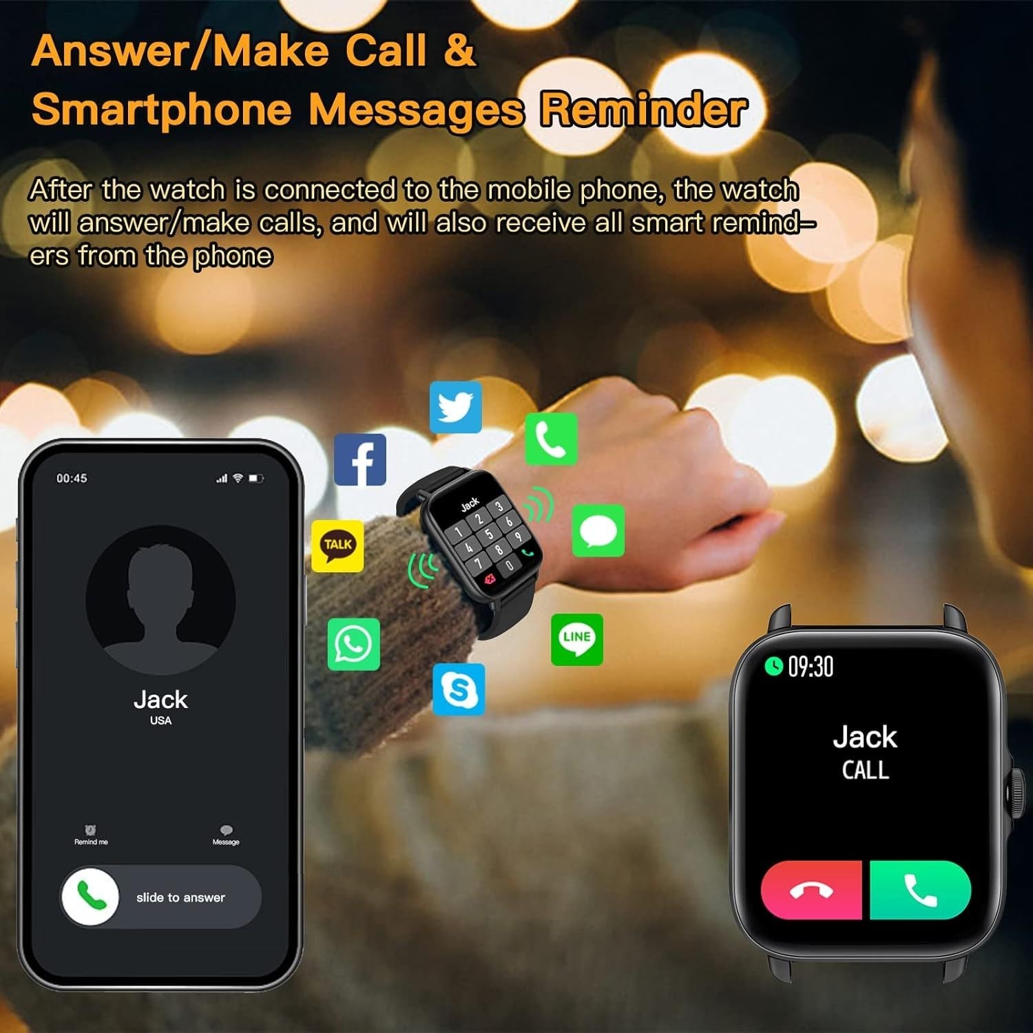 - ?????Make & Answer Calls & Smart Notifications?: The newly designed smart watch for phone calls in 2022, after connecting to Bluetooth, you can make/answer calls, high-quality Bluetooth will bring you clear call experience (can set ringtones or vibrations, add 8 contacts and view call logs); The smart watch can set notification reminders, receive calls, messages, Facebook, WhatsApp, etc. Real-time notification, you will not miss any important information when your phone is not around.